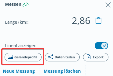 Sie können an verschiedenen Stellen im BayernAtlas durch einen Klick auf den Button Geländeprofil sich das Geländeprofil – einen senkrechten Schnitt durch das Gelände – entlang einer Linie oder Strecke anzeigen lassen: beim Messen, beim Zeichnen, beim Routing.